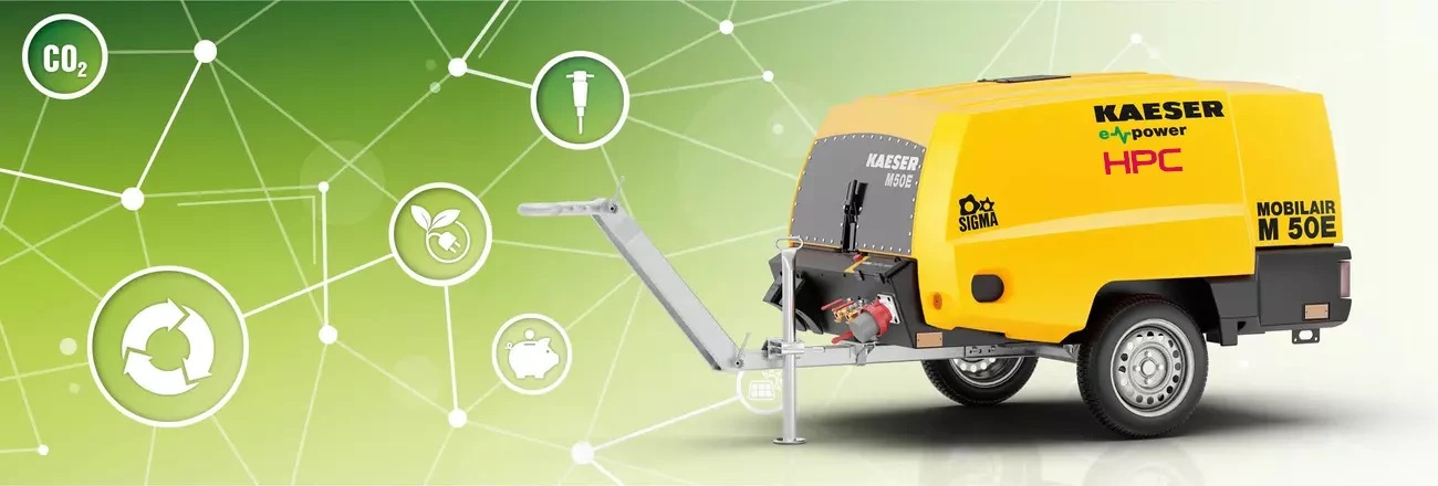 With the electric MOBILAIR M 50E SFC, HPC KAESER brings the energy efficiency of the future directly to the construction site – demonstrating how intelligent control technology saves energy, costs, and resources.