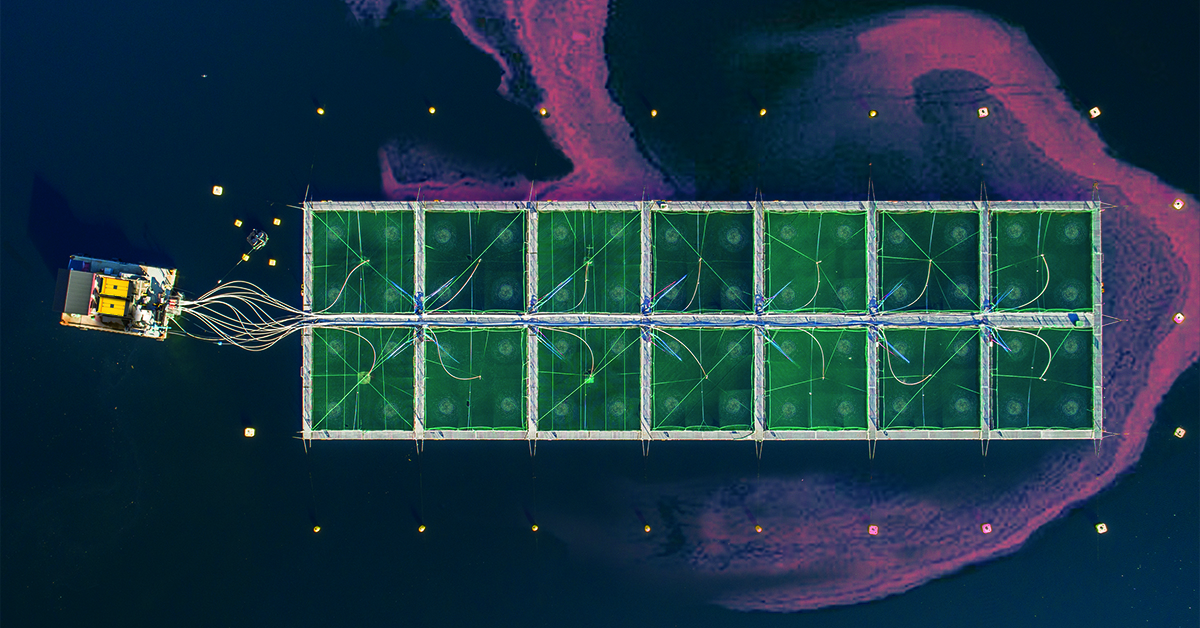 When the water with the lower density hits the surface, it spreads out to the sides. By spreading out to the sides, it pushes the surface water outwards and with it the harmful algae. If controlled well, the fish will never be in contact with the algae bloom, as the air is constantly pumped into the sea pens.