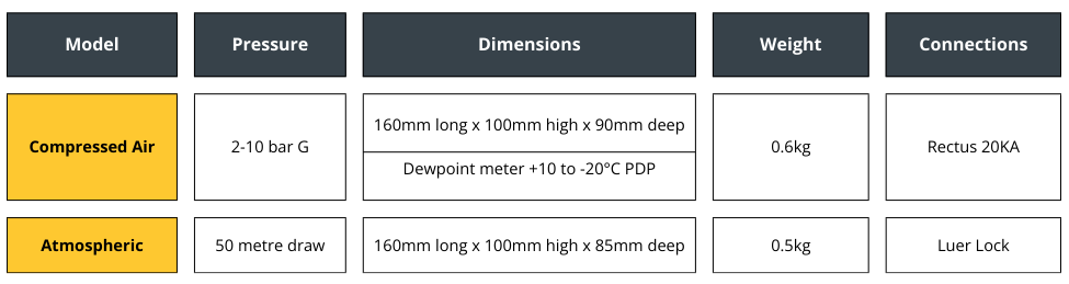 - As standard the compressed-air version is fitted with a dewpoint meter rated down to -20°C PDP.